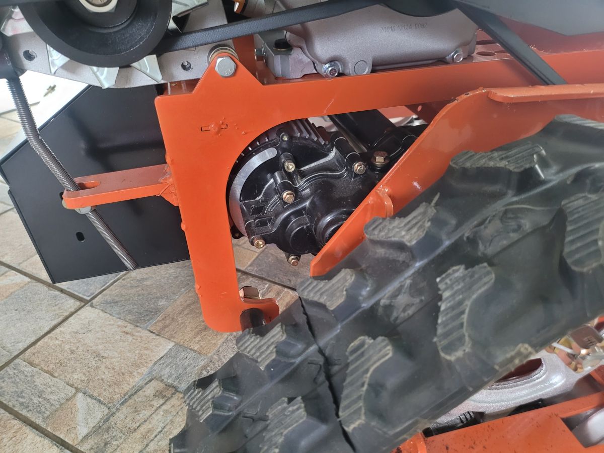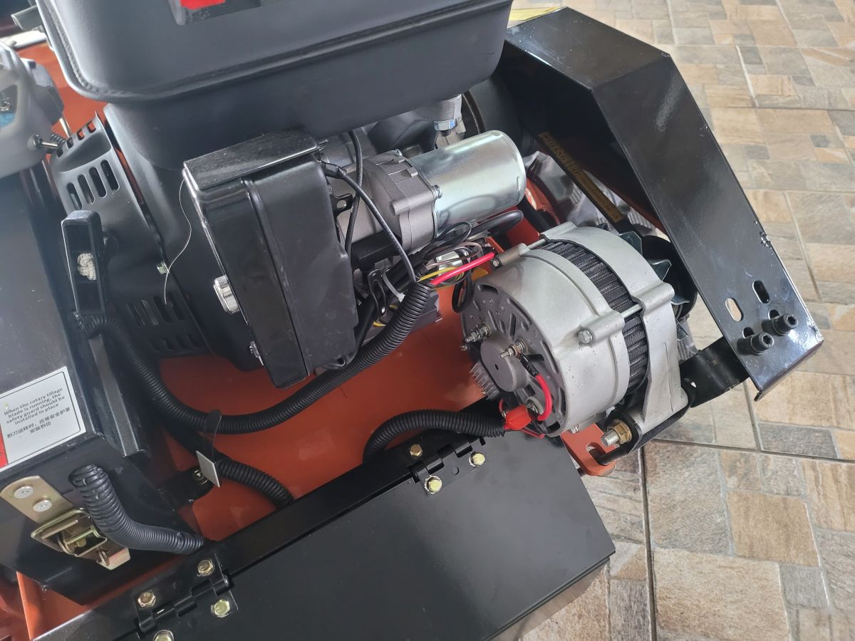 Řemenový převod přenáší výkon motoru na výkonný alternátor. Ten průběžně a plynule dobíjí dva akumulátory a pohání dva elektromotory pojezdu Elektrosoustava pojezdu mulčovače a zdvihu mulčovacího ústrojí pracuje ve 24 V.