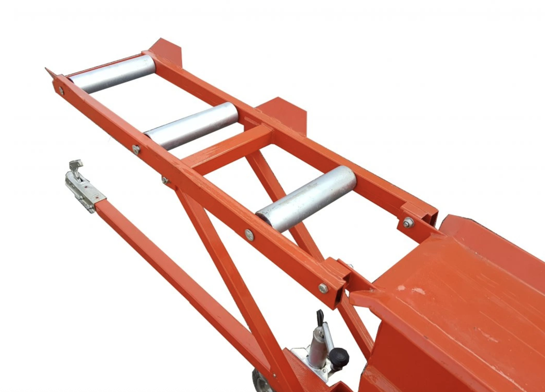 Vkládací ústrojí - Multiforest 7T je vybaven válečkovým dopravníkem pro snadnější manipulaci se dřevem. Dva pracovníci jsou schopni zpracovávat i delší kmeny. Pro snadnější převoz je možno dopravník sklopit.